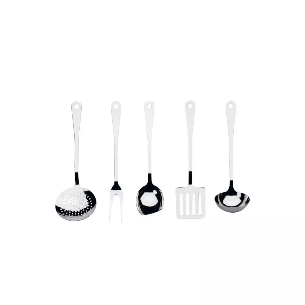 Servizio di posate da cucina: cucchiaio da cucina, forchettone, mestolo da cucina, paletta da cucina, schiumaiola in acciaio lucido. Codice: : AJM19S5 L