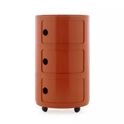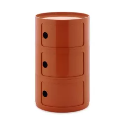 Disegnato da Anna Castelli Ferrieri nel 1967, il Componibile a 3 elementi è un’icona del design italiano, simbolo di funzionalità, modularità ed estetica senza tempo. Viene solitamente utilizzato come tavolino laterale accanto a divani o poltrone, mobiletto da ufficio o studio, contenitore per ingresso, mobile da bagno o comodino. La versione tonda da 42 cm si presenta in un abito rinnovato grazie a un nuovo stampo industriale che ne esalta qualità, dettagli e resa visiva. La palette cromatica si arricchisce con nuance contemporanee che dialogano con raffinate suggestioni rétro, confermando questo contenitore come un elemento versatile per ogni ambiente. I moduli si uniscono tramite un pratico sistema a incastro, creando una soluzione compatta, elegante e personalizzabile, con la possibilità di aggiungere ruote acquistabili separatamente.