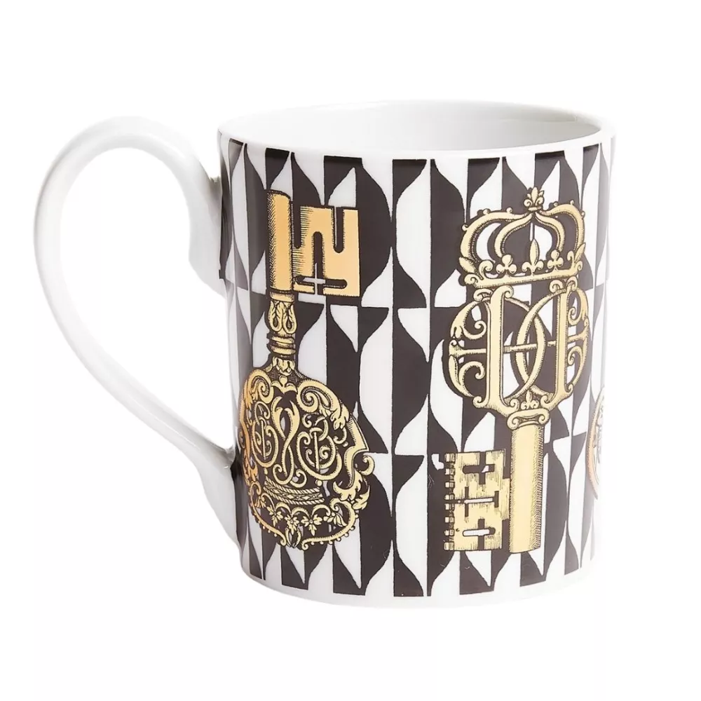 La Mug Chiavi e Losanghe di Fornasetti è un raffinato esercizio di equilibrio tra realtà e illusione. Il decoro, serigrafato a mano su porcellana, mette in dialogo l’eleganza dorata delle chiavi antiche con la geometria rigorosa del bianco e nero. Parte della collezione Antichità Contemporanea presentata alla Milan Design Week 2021, questa tazza trasforma un oggetto quotidiano in un pezzo da collezione ricco di fascino e suggestione.
