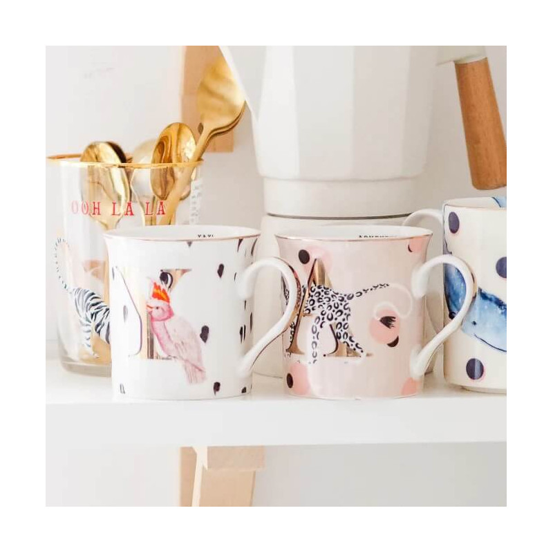MUG ALFABETO PICCOLA, "N" DI NO STRESS, A22002064 - YVONNE ELLEN Ogni tazza dell'alfabeto presenta un animale o un uccello esotico dipinto con cura su una elegante iniziale personalizzata. La lettera si riferisce ad una personalità o modo di essere e riprendono l'animale che più la rappresenta, in questo caso "N" di No Stress. Ciascuna tazza presenta una sorpresa divertente nell'incisione del marchio Yvonne Ellen un calabrone e l'iniziale minuscola sul fondo. Questa Gold Edition della tazza dell'alfabeto è perfetta per chi ama avere una tazza personalizzata, o come regalo per una persona speciale. Le tazze sono fatte di fine bone china e caratterizzate da dettagli dorati bellissimi. Non adatto a lavastoviglie o microonde Modello: A22002064 Materiale: Bone china Misure: Ø 8,5 cm x 9 cm
