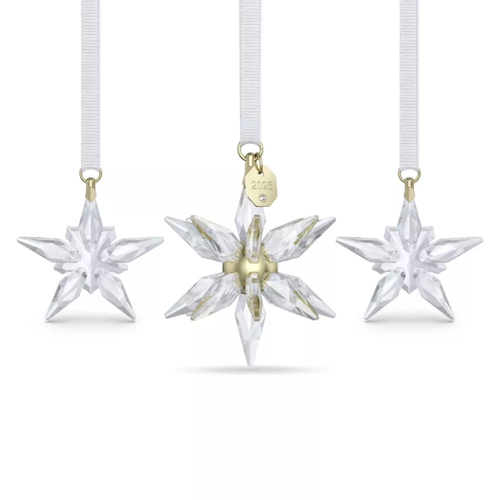 Il set Annual Edition Decorazioni 3D 2025 di Swarovski aggiunge una luce magica e raffinata alle atmosfere natalizie. Ispirato alla serenità del cielo notturno, il trio comprende una grande decorazione 3D e due piccole stelle scintillanti, per un totale di 773 sfaccettature che catturano e riflettono la luce con eleganza. Ogni elemento è sospeso da un nastro in gros-grain bianco con dettagli placcati in oro champagne e la targhetta incisa “2025” sulla stella principale. Un insieme prezioso che dona splendore e armonia a qualsiasi ambiente festivo.