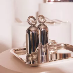 Il set sale e pepe della collezione Vertigo di Christofle aggiunge un tocco di modernità ed eleganza giocosa alla tavola. Caratterizzato dall’iconico anello asimmetrico che contraddistingue l’intera collezione, questo raffinato set è stato disegnato da Andrée Putman per unire stile e funzionalità in un design contemporaneo e distintivo.
