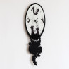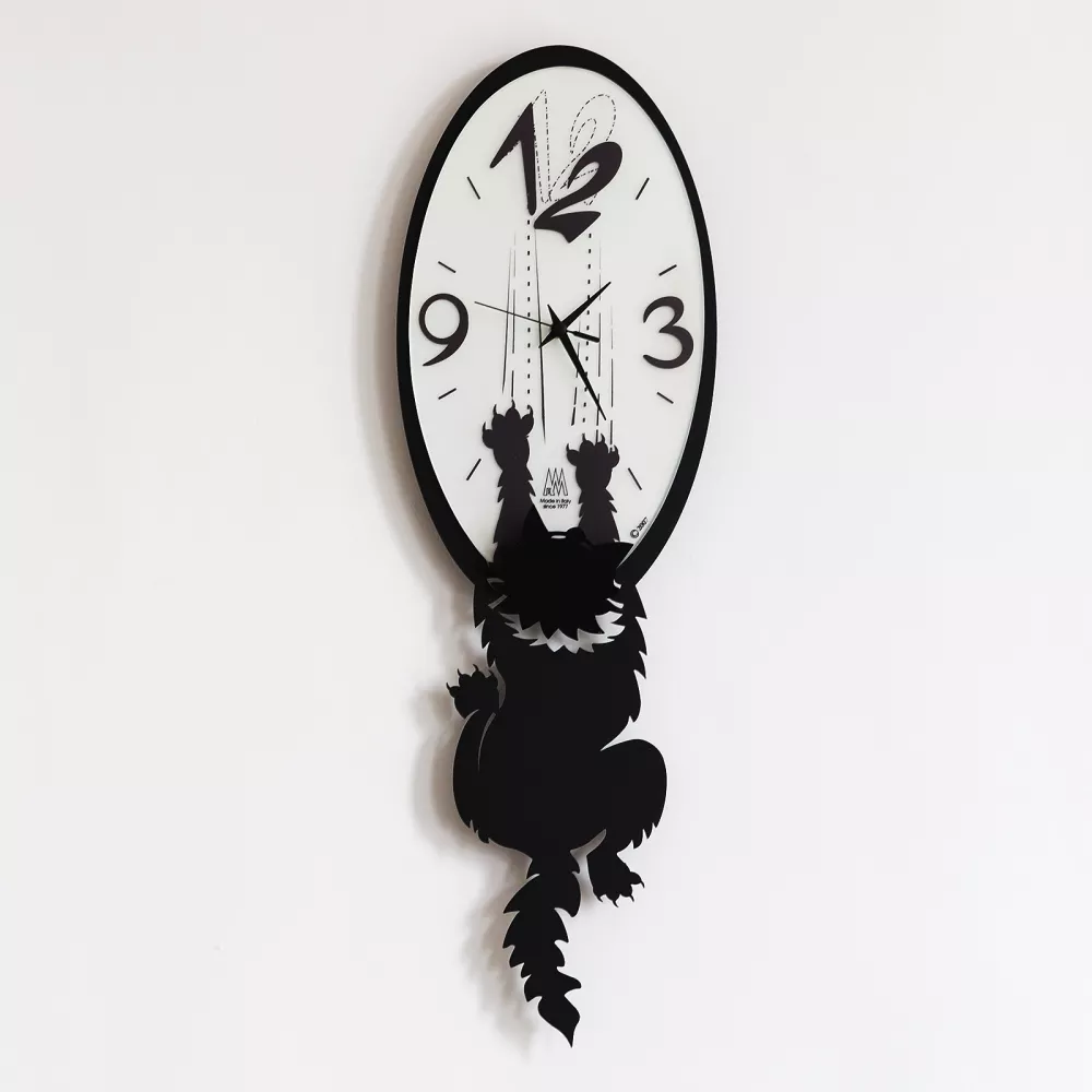 Simpatico gatto Crazy Tommy che scivola dall'orologio da parete. Materiale: ferro e vetro. Dimensioni: 20x65 cm Nella confezione e' in dotazione il tassello e il gancio per la corretta applicazione a parete. Codice: 1869/C71