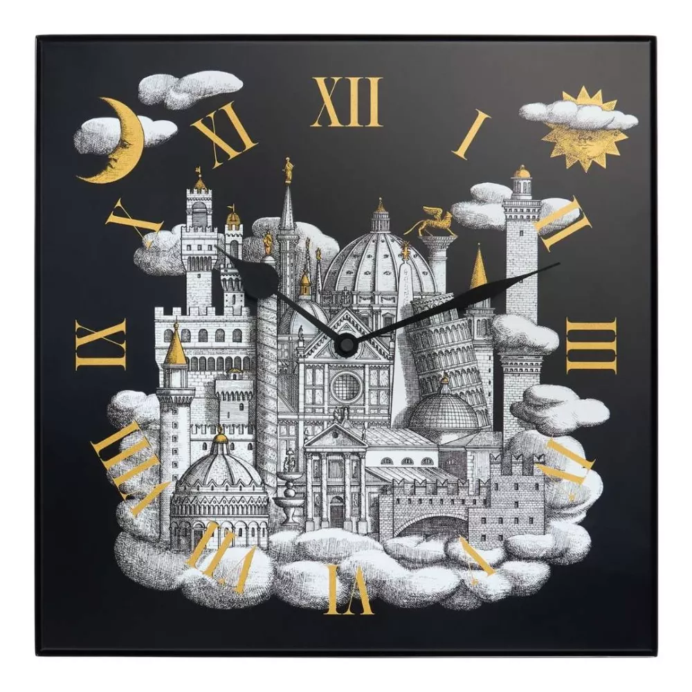 Un omaggio all’Italia che unisce rigore e immaginazione: le architetture del Bel Paese appaiono sospese tra le nuvole in questo orologio da parete, coniugando precisione grafica e dimensione onirica. La scocca in metallo resistente è decorata a mano dall’Atelier milanese, mentre il movimento delle lancette è silenzioso e continuo. Ogni creazione è un pezzo unico, frutto della maestria artigianale che contraddistingue Fornasetti.