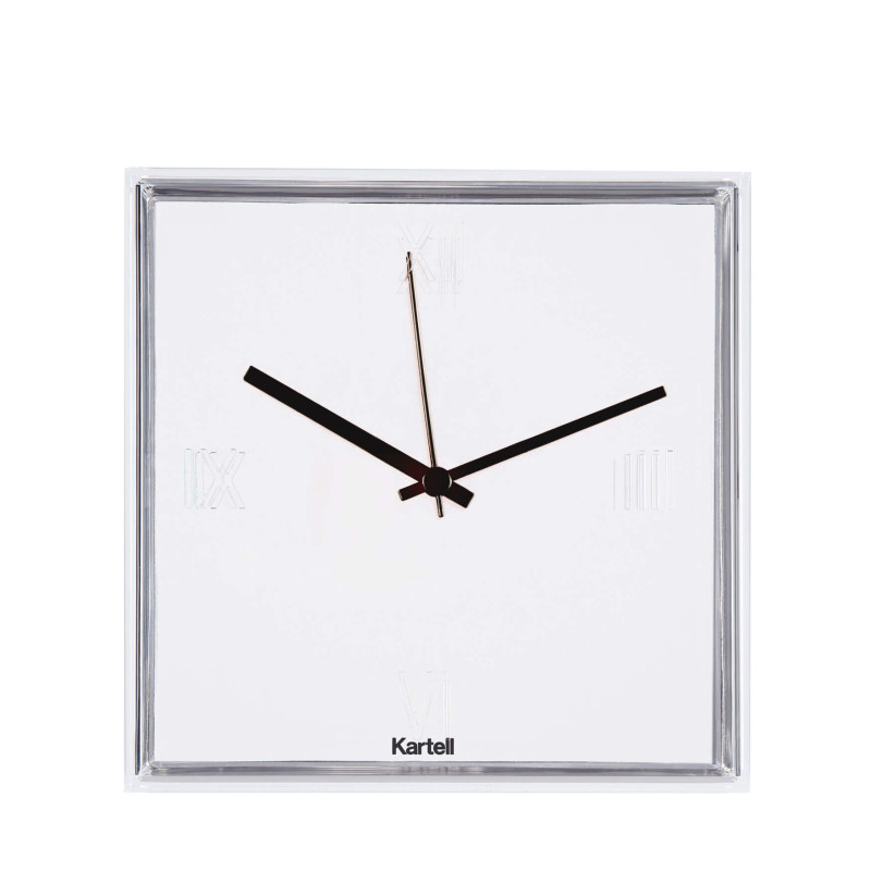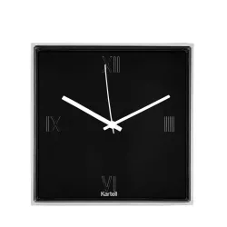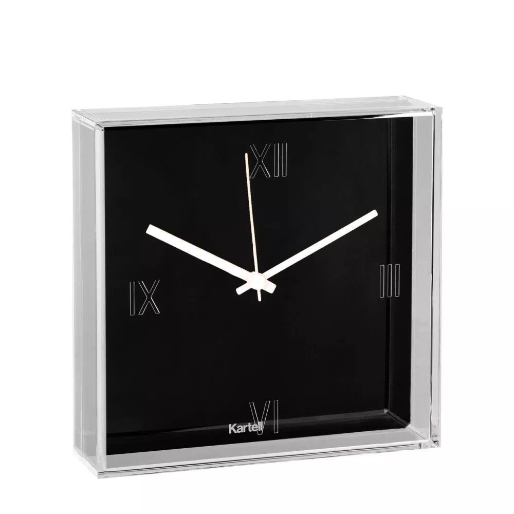 OROLOGIO DA TAVOLO E PARETE, TIC & TAC 1900 - KARTELL Kartell tiene il conto delle ore e presenta il suo primo orologio da parete e da superficie. Si tratta di una "scatola" quadrata trasparente, delle dimensioni di 30x30 cm, con i numeri romani incisi sulla superficie che racchiude un quadrante piatto. Su questo quadrante spicca una coppia di sottili lancette colorate, creando una sintesi cromatica che trasforma il tempo in un'esperienza estetica. Tic & Tac è un orologio con spessori importanti che creano giochi di luce e riflessi. L'inconfondibile stile di Starck viene enfatizzato dal colore arancione delle lancette, che è il colore preferito del designer. Il quadrante è disponibile in bianco, nero o cromato in una gamma di tonalità metalliche. Dimensioni: Larghezza: 30 cm Profondità: 8 cm Altezza: 30 cm