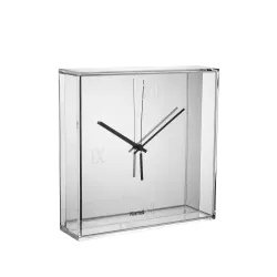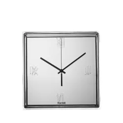 OROLOGIO DA MURO E DA TAVOLO, TIC & TAC 1910 - KARTELL Kartell tiene il conto delle ore e presenta il suo primo orologio da parete e da superficie. Si tratta di una "scatola" quadrata trasparente, delle dimensioni di 30x30 cm, con i numeri romani incisi sulla superficie che racchiude un quadrante piatto. Su questo quadrante spicca una coppia di sottili lancette colorate, creando una sintesi cromatica che trasforma il tempo in un'esperienza estetica. Tic & Tac è un orologio con spessori importanti che creano giochi di luce e riflessi. L'inconfondibile stile di Starck viene enfatizzato dal colore arancione delle lancette, che è il colore preferito del designer. Il quadrante è disponibile in bianco, nero o cromato in una gamma di tonalità metalliche. Larghezza: 30 cm Profondità: 8 cm Altezza: 30 cm