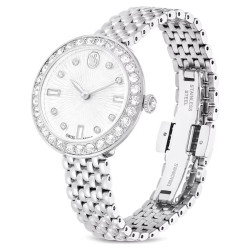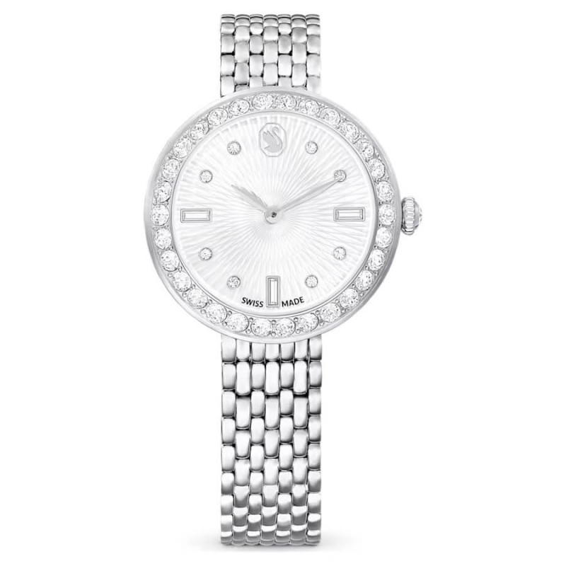 L'orologio presenta una cassa circolare di 30 mm realizzata in acciaio inossidabile, arricchita da una lunetta adornata con 30 cristalli. Attraverso il vetro minerale, si rivela un quadrante incantevole con motivo guilloché, impreziosito dal logo Swarovski a forma di cigno posizionato alle 12, insieme a indici realizzati con cristalli tagliati nei modelli Round e Baguette. La corona dell'orologio è ornata da un singolo cristallo. Per aggiungere un tocco di eleganza al polso, l'orologio è dotato di un bracciale a sette maglie in acciaio inossidabile. Questo orologio Swiss Made è resistente all'acqua fino a 50 metri, progettato con un'eccellente raffinatezza per assicurare la puntualità nei tuoi impegni giornalieri. Articolo nr.: 5673022 Collezione: Certa Materiale: Cristalli, Acciaio inossidabile Colore: Color argento Materiale del cinturino: Metallo Prodotto in: Svizzera Meccanismo dell'orologio: Quarzo