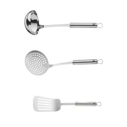 Il set utensili da cucina Profi Plus di WMF è la soluzione completa per ogni preparazione culinaria. Realizzati in resistente acciaio inox Cromargan®, questi utensili garantiscono robustezza, igiene e lunga durata. Il set da 7 pezzi comprende mestolo, schiumarola, spatola, paletta wok, frusta, pelapatate e un pratico supporto salvaspazio che tiene tutto in ordine e a portata di mano. Ogni utensile è lavabile in lavastoviglie ed è dotato di occhiello per essere appeso, combinando funzionalità e un design elegante che si adatta a ogni cucina.