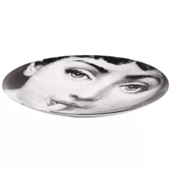 Il volto di Lina Cavalieri, reinterpretato dal genio creativo di Piero Fornasetti, impreziosisce questo piatto in porcellana decorata a mano della collezione Tema e Variazioni. Un vero pezzo da collezione, da appendere come piatto da parete grazie ai fori predisposti sul retro o da utilizzare come raffinato elemento ornamentale per la tavola. Ogni minima variazione riflette la lavorazione artigianale, rendendo unica ogni creazione.