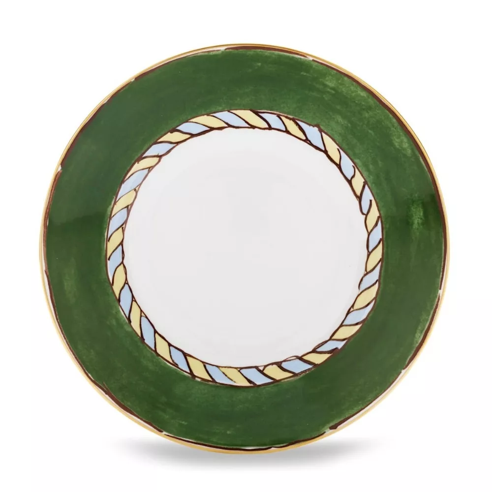 Le linee classiche della forma Impero incontrano la brillante filettatura in oro zecchino in questo elegante piatto fondo in porcellana. Il decoro in tonalità Amalfi Lemon e il bordo con motivo a corda evocano l’estetica mediterranea e l’universo marino, cifra stilistica della collezione Il Viaggio di Nettuno. Un capolavoro firmato Luke Edward Hall, ideale per aggiungere carattere e bellezza alla tavola quotidiana o a occasioni speciali.