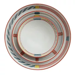 Il piatto fondo Tressages Équestres di Hermès è un raffinato omaggio all’universo equestre. Realizzato in porcellana fine e decorato a mano con motivi cromolitografici, presenta intrecci e dettagli ispirati ai finimenti e alle passamanerie della tradizione Hermès. Ogni elemento della collezione, disegnata da Virginie Jamin, racconta la bellezza del gesto artigianale e la passione per l’eccellenza che contraddistingue la Maison parigina. Un capolavoro di eleganza e maestria francese.