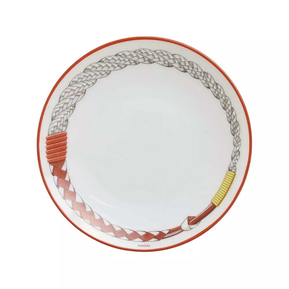 Il piatto pane e burro Tressages Équestres di Hermès reinterpreta le origini della Maison ispirandosi all’arte della passamaneria e dell’intreccio della selleria. Disegnato da Virginie Jamin sotto la direzione artistica di Benoit Pierre Emery, unisce motivi figurativi e astratti in una composizione raffinata che gioca con i contrasti di colori come giallo limone, verde menta, blu petrolio e le tonalità naturali delle fibre. Realizzato in porcellana francese di altissima qualità e decorato con cromolitografie applicate a mano, è un dettaglio prezioso che arricchisce la mise en place con uno stile elegante e senza tempo.