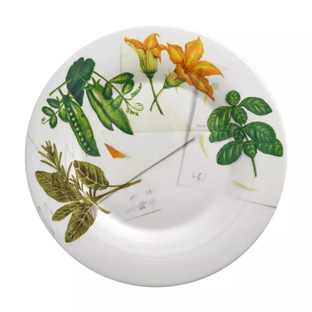 PIATTO PIANO 28 CM, VEGAN CUCINA ITALIANA - GEMINIANO COZZI La rappresentazione grafica cattura lo stile degli anni Ottanta e Novanta mescolando e sovrapponendo disegni realizzati con tecnica mista da un'illustratrice dell'epoca. Le carte vengono riprodotte in uno stile collage con note originali e segni di stampa visibili, creando una connessione unica con le riviste del passato. Numero articolo: TTCMI00281047 Diametro: 28 cm Peso: approx. 0.6 kg Colore: Decorato Materiale: Real Fine Bone Porcelain