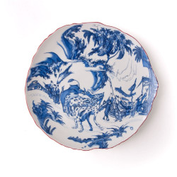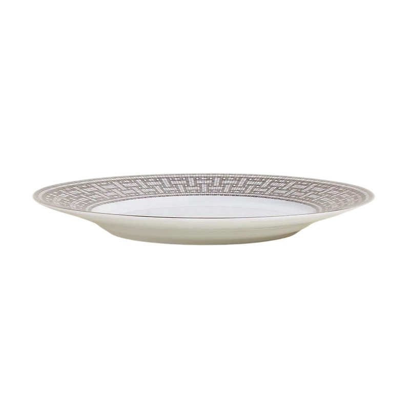Un'eleganza senza tempo definisce il piatto piano della collezione Mosaïque au 24. Realizzato in porcellana con decorazioni serigrafate e applicate a mano, celebra i codici estetici della storica boutique Hermès di rue du Faubourg-Saint-Honoré, a Parigi. L'interpretazione monocromatica in tonalità di grigio è esaltata dalla brillantezza del platino, evocando i mosaici Art Déco che decorano la boutique della Maison.
