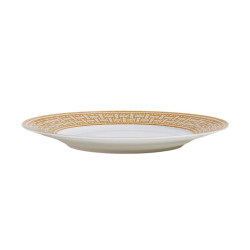 Un'eleganza senza tempo definisce il piatto piano della collezione Mosaïque au 24. Realizzato in porcellana con decorazioni serigrafate e applicate a mano, celebra i codici estetici della storica boutique Hermès di rue du Faubourg-Saint-Honoré, a Parigi. L'interpretazione monocromatica in tonalità di grigio è esaltata dalla brillantezza del platino, evocando i mosaici Art Déco che decorano la boutique della Maison.