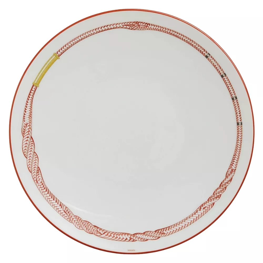 Il piatto piano Tressages Équestres di Hermès celebra le origini della Maison, ispirandosi all’arte dell’intreccio e alla passamaneria utilizzata nella selleria. Disegnato da Virginie Jamin sotto la direzione artistica di Benoit Pierre Emery, questo servizio da tavola combina rappresentazioni figurative e astratte, giocando con i contrasti cromatici di giallo limone, menta, blu petrolio e le tonalità naturali delle fibre e del cuoio. Realizzato in pregiata porcellana francese con decorazione a cromolitografia applicata a mano, è un capolavoro che arricchisce ogni mise en place con raffinatezza ed esclusività.