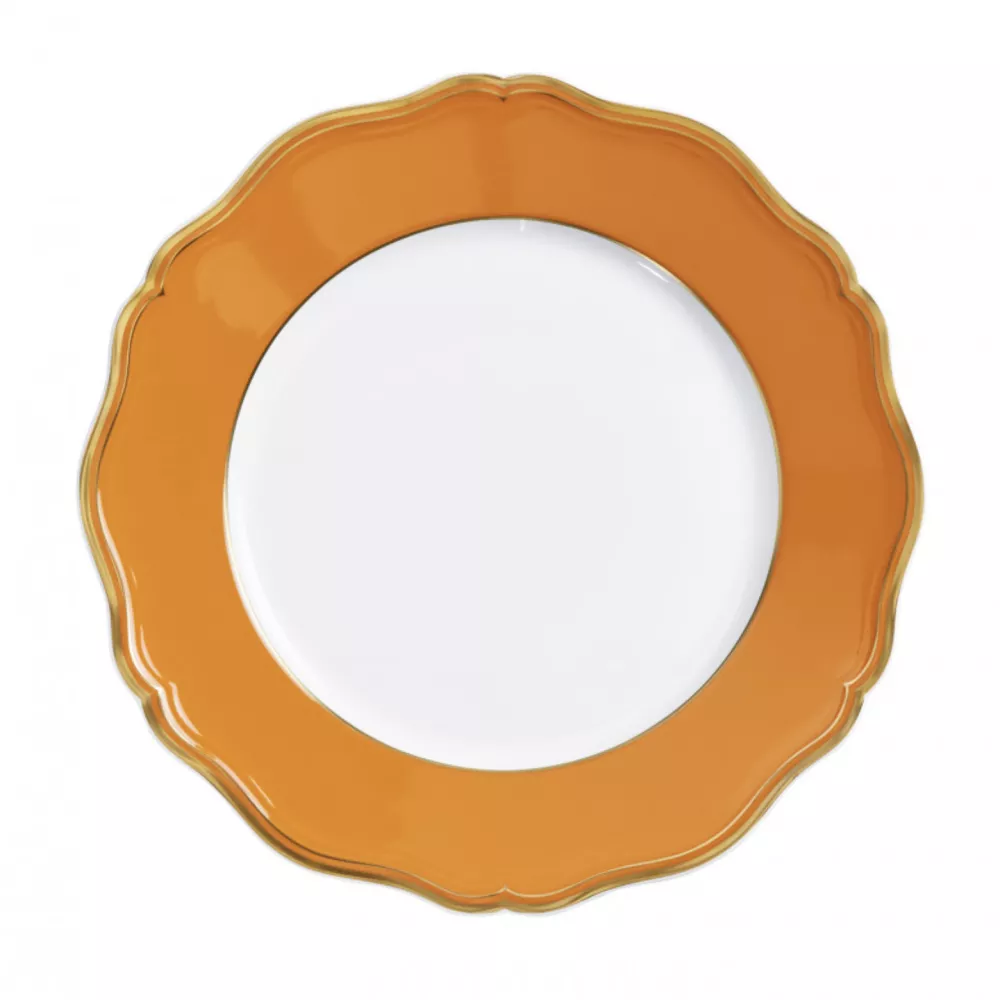 Regali bordi in oro si ispirano e rivisitano in cangianti colori la collezione Polka. Otto colori conferiscono modernità a questo decoro Luigi XV: grigio blu, avorio, giallo, nero, arancione, rosso, turchese e verde. Riferimento : 0869-01-101027 Dimensioni : Diametro 27 cm Materiale : Porcelain Colore : Arancio