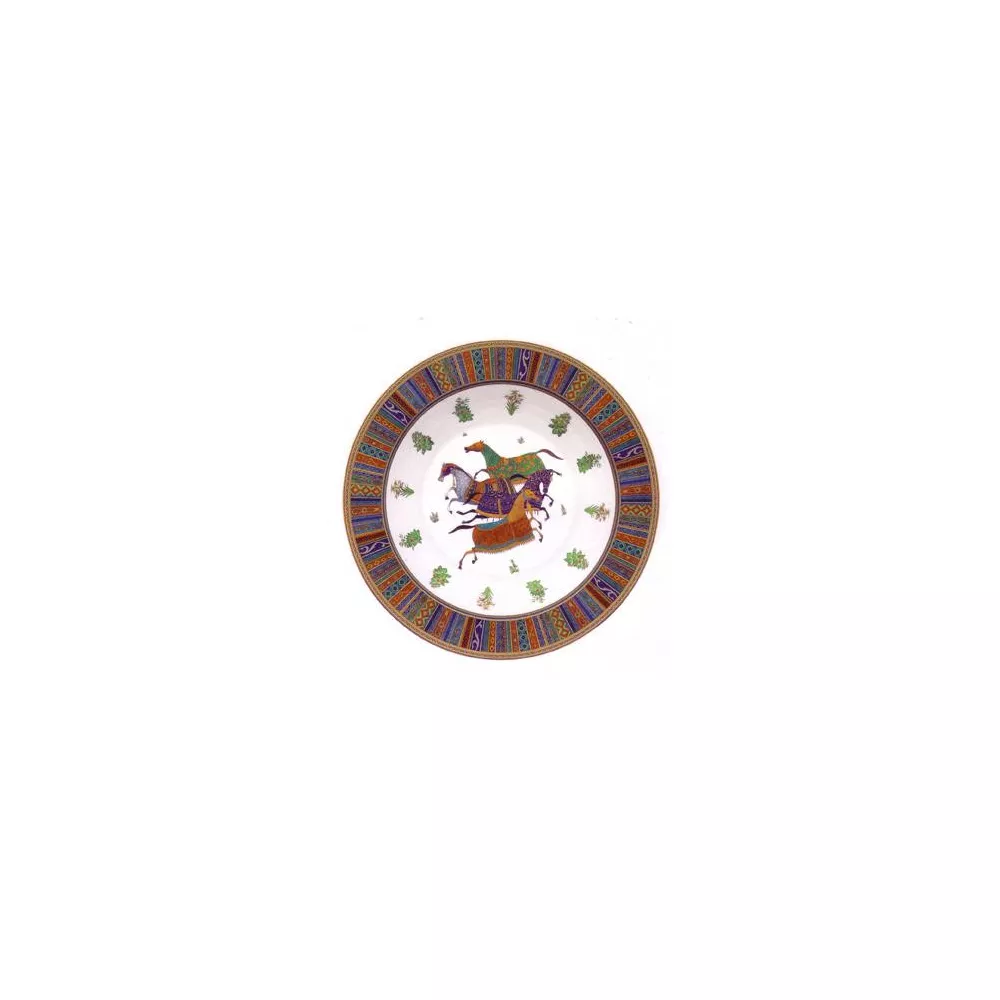 Hermes Cheval D'Orient Vassoio Tondo Fondo Codice: 9826P In una steppa bianca di neve, tra ciuffi d'erba primaverili, galoppano dei cavalli. La loro cavalcata silenziosa proviene da un'epoca che ignora il tempo.Galoppano su una coltre punteggiata di porpora, azzurro intenso e oro, provenienti da quell'Oriente di sogno illustrato dalle miniature persiane. Dimensioni: 42 cm Materiale: porcellana Per tutti i prodotti Hermés non disponibili al momento dell'acquisto, si prega di considerare tempistiche di consegna dai 6 fino ad oltre i 12 mesi.