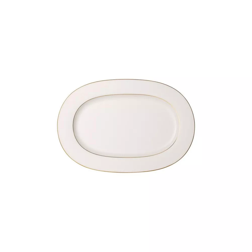 La collezione Anmut Gold colpisce per le linee del decoro in oro dipinte a mano su pregiata ed elegante porcellana bianca. La perfetta interazione tra Premium Bone Porcelain e l'oro impreziosisce con eleganza la collezione. Perfetta per chi ama allo stesso modo qualità ed eleganza. Nel vassoio ovale piano si può servire una grande varietà di prelibatezze. Dimensions 41CM Istruzioni per la cura Lavabile in lavastoviglie Material PIM porcellana Bone Premium