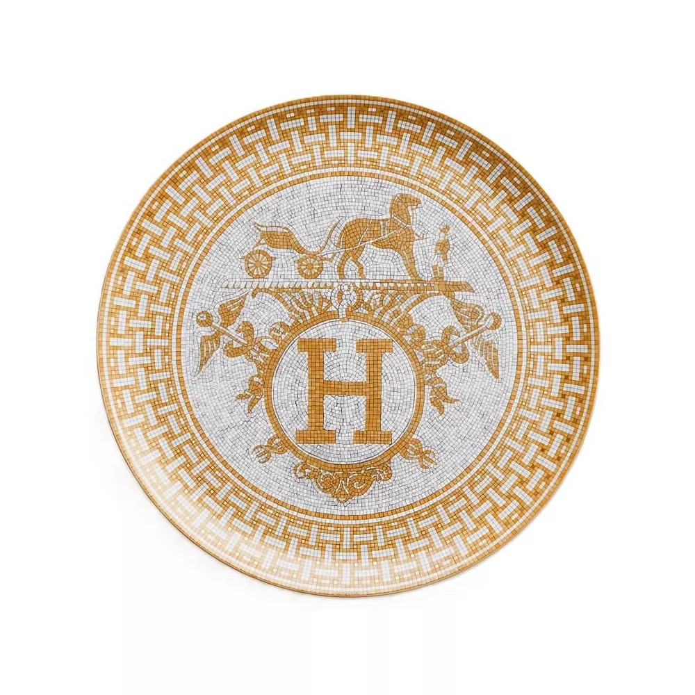 Un'opera d'arte in porcellana decorata a mano, il piatto torta della collezione Mosaïque au 24 rende omaggio all'estetica originale della storica boutique Hermès di rue du Faubourg-Saint-Honoré, a Parigi. Geometrie raffinate e cabochon in oro e platino si fondono in un design ispirato all'Art Déco e all’antica Grecia. Al centro, il celebre monogramma “H” o l’ex-libris della Maison, per un tocco di esclusività e raffinatezza.