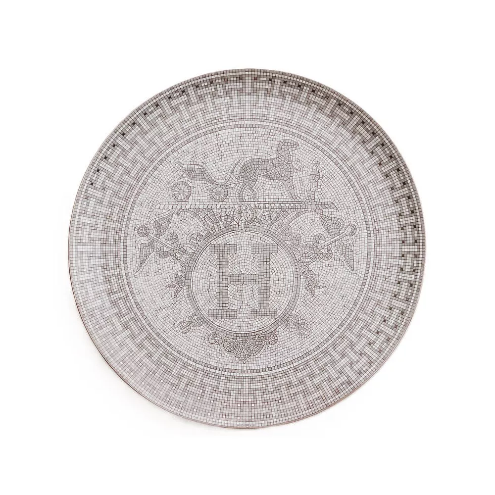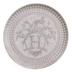 Un'opera d'arte in porcellana decorata a mano, il piatto torta della collezione Mosaïque au 24 rende omaggio all'estetica originale della storica boutique Hermès di rue du Faubourg-Saint-Honoré, a Parigi. Geometrie raffinate e cabochon in oro e platino si fondono in un design ispirato all'Art Déco e all’antica Grecia. Al centro, il celebre monogramma “H” o l’ex-libris della Maison, per un tocco di esclusività e raffinatezza.