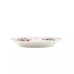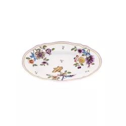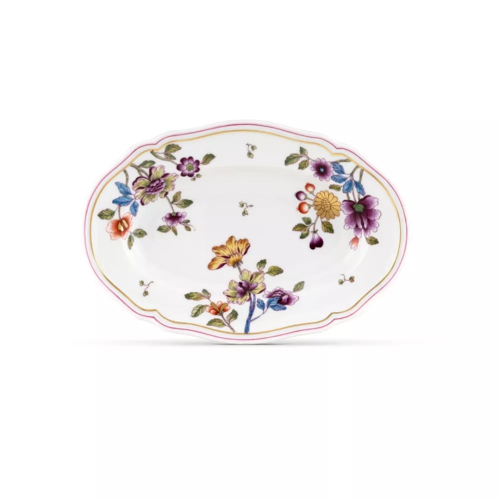 La raviera Granduca Coreana di Ginori 1735 esprime raffinatezza decorativa e tradizione senza tempo. Il celebre motivo alla Coreana, ispirato alle trame dei kimono imperiali e al decoupage amato dalle nobildonne fiorentine, e impreziosito dalla peonia, simbolo di bellezza e felicita. La filettatura in oro zecchino, firma iconica della manifattura, valorizza la forma Antico Doccia, rendendo questo vassoio ideale per servire portate di accompagnamento con sofisticata eleganza e completare la mise en place della collezione.