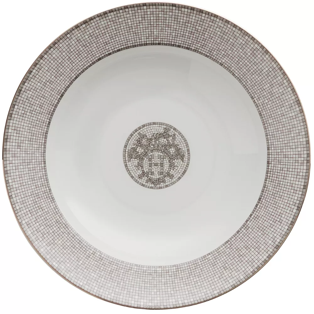 Il vassoio rotondo fondo Mosaique au 24 di Hermès rappresenta un perfetto equilibrio tra arte decorativa e lusso contemporaneo. Realizzato in porcellana con decorazioni serigrafate e applicate a mano, è impreziosito da cabochon in oro o platino che esaltano i raffinati motivi geometrici iconici della collezione.