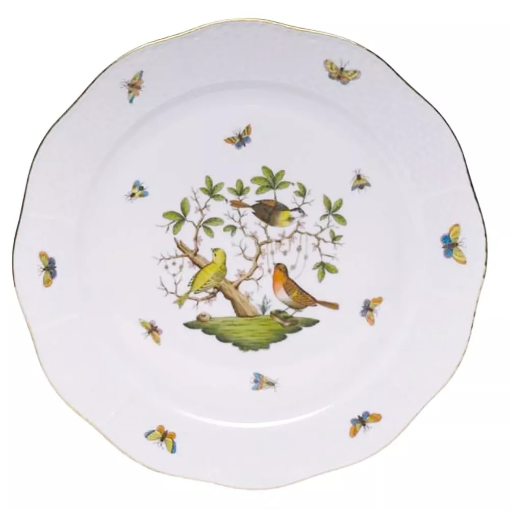 Rothschild Birds, uno dei decori Herend più conosciuti, prende il nome dall'importante famiglia baronale dei Rothschild ed ha come protagonisti due uccelli (sono raffigurate dodici diverse specie di uccelli appoggiati ad un ramo stilizzato). Il decoro si ispira a un racconto del XIX secolo sulla baronessa Rothschild, che perse dei preziosi di perle nel giardino della sua residenza viennese. Venne ritrovata diversi giorni dopo dal suo giardiniere che notò due uccellini giocarci su di un albero. Vassoio rotondo 34,5 cm Materiale: porcellana con decorazioni in oro Codice: 1151 Si consiglia il lavaggio a mano. Mai mettere nel microonde un articolo con finiture oro o platino.