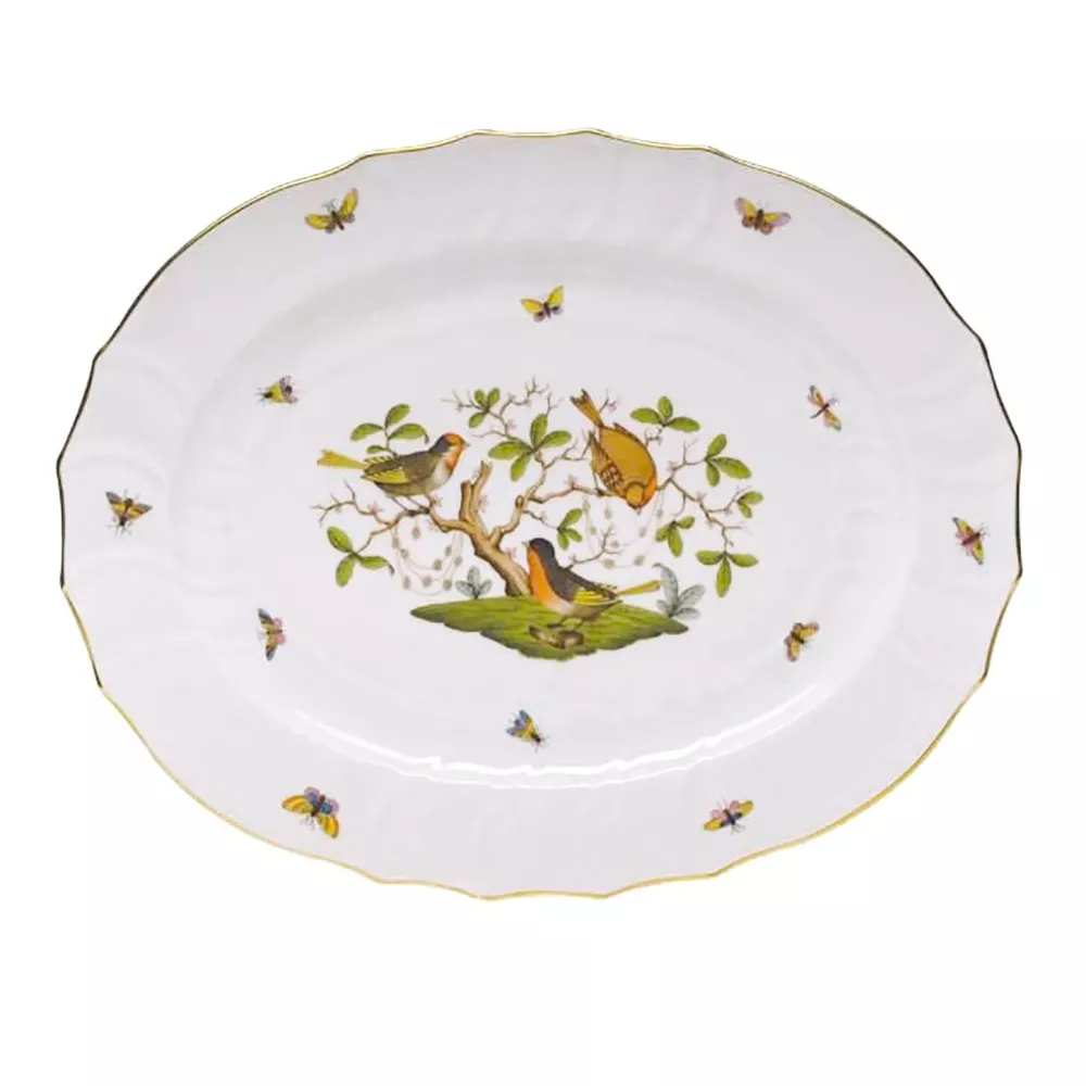 Rothschild Birds, uno dei decori Herend più conosciuti, prende il nome dall'importante famiglia baronale dei Rothschild ed ha come protagonisti due uccelli (sono raffigurate dodici diverse specie di uccelli appoggiati ad un ramo stilizzato). Il decoro si ispira a un racconto del XIX secolo sulla baronessa Rothschild, che perse dei preziosi di perle nel giardino della sua residenza viennese. Venne ritrovata diversi giorni dopo dal suo giardiniere che notò due uccellini giocarci su di un albero. Vassoio ovale 42 x 32 cm Materiale: porcellana con decorazioni in oro Codice: 1101 Si consiglia il lavaggio a mano. Mai mettere nel microonde un articolo con finiture oro o platino.