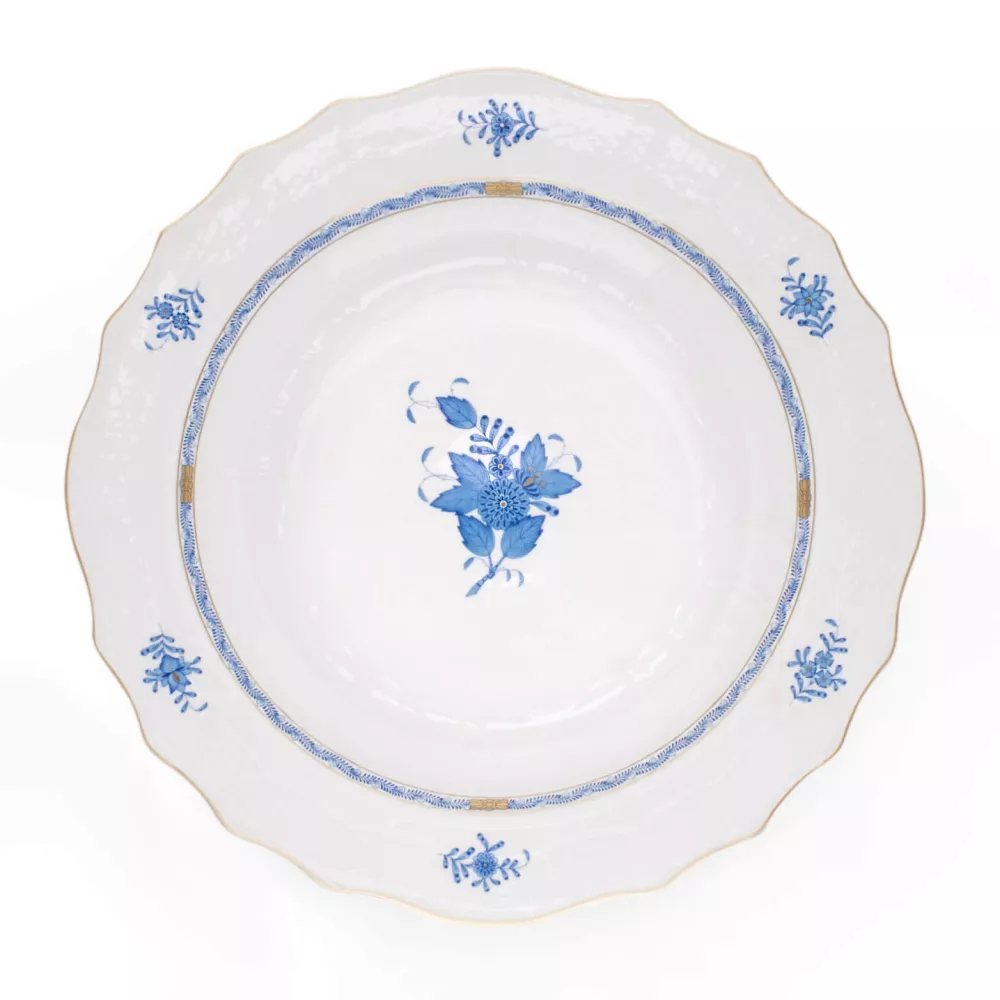 Il decoro, noto anche come Chinese Bouquet, è stato creato per il Conte Albert Apponyi, un famoso politico e diplomatico ungherese della fine dell'800. Il disegno raffigura un cesto di fiori indiani stilizzati dipinti rigorosamente a mano libera dai maestri pittori di Herend. Vassoio Rotondo 38,5 cm Materiale: porcellana con decorazioni in oro Codice: 1161 Si consiglia il lavaggio a mano. Mai mettere nel microonde un articolo con finiture oro o platino.