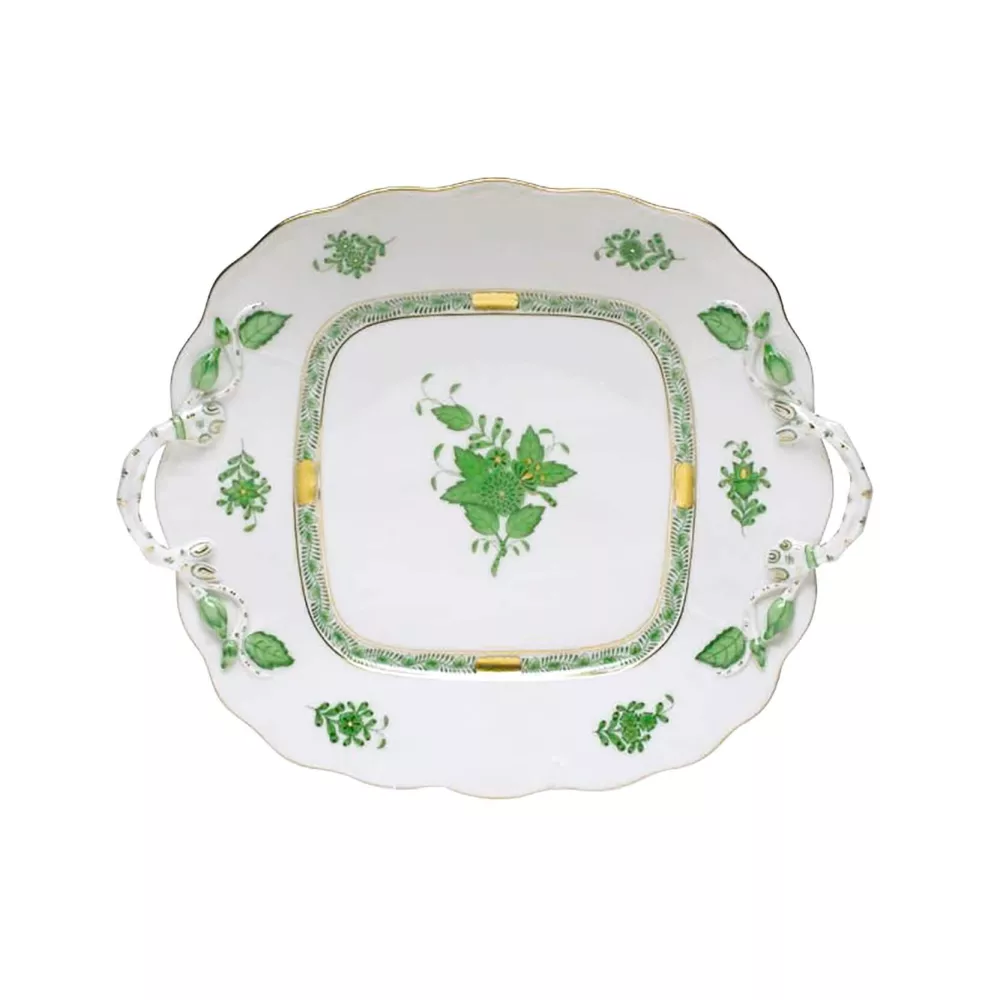 Il decoro, noto anche come Chinese Bouquet, è stato creato per il Conte Albert Apponyi, un famoso politico e diplomatico ungherese della fine dell'800. Il disegno raffigura un cesto di fiori indiani stilizzati dipinti rigorosamente a mano libera dai maestri pittori di Herend. Piatto torta quadrato 28 x 24,5 cm Materiale: porcellana con decorazioni in oro Codice: 1430 Si consiglia il lavaggio a mano. Mai mettere nel microonde un articolo con finiture oro o platino.