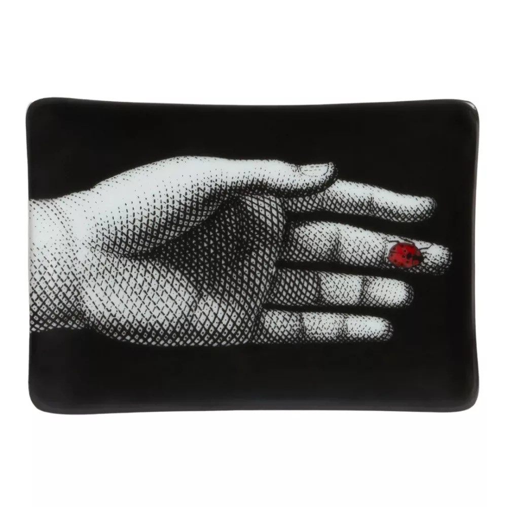 Il posacenere Mano con Coccinella esprime tutta la poetica fornasettiana, in cui la mano diventa simbolo creativo e decorativo. Realizzato in porcellana decorata a mano, questo oggetto prezioso unisce funzionalità e arte, trasformandosi in un raffinato complemento per la tavola o in un esclusivo elemento ornamentale. Ogni pezzo, frutto della lavorazione artigianale, possiede unicità e carattere irripetibile.