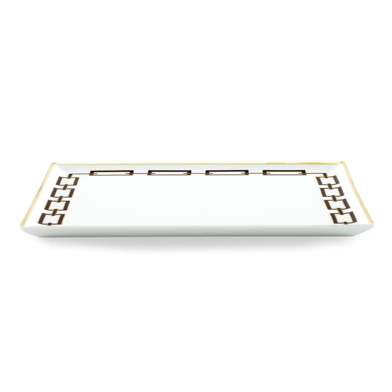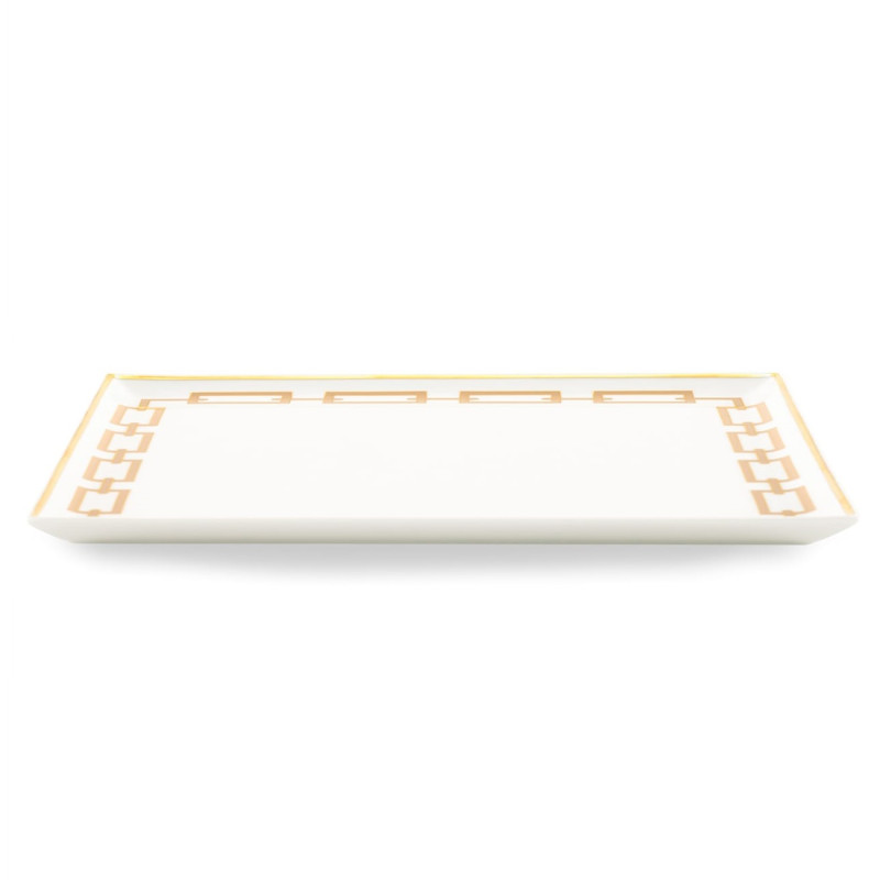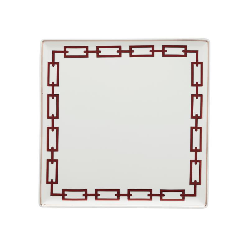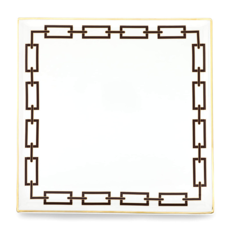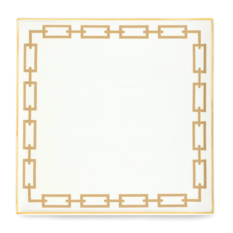 PIATTO SVUOTATASCHE 30 X 30 CM, CATENE IMPERO - RICHARD GINORI Catene è una collezione di prodotti per la tavola, tra cui articoli come tazze, piatti, tè e caffè, insieme a decorazioni per la casa. Questa collezione è disponibile in quattro affascinanti varianti di colore: Nero, Smeraldo, Zaffiro e Scarlatto. I bellissimi disegni che caratterizzano Catene sono stati ereditati dal rinomato Gio Ponti, che fu il direttore artistico durante la prima metà del secolo scorso per Ginori. La forma storica di questa collezione è l'Impero, che accoglie in modo armonioso l'estetica sofisticata di Catene. Per donare una lucentezza e un tocco di raffinatezza ulteriori, Ginori ha applicato una delicata finitura in oro puro che impreziosisce piatti, tazze, vasi e tutte le raffinate porcellane della collezione. Non adatto al microonde Usare in lavastoviglie solo con cicli delicati Forma: Impero Materiale: Porcellana Made in Italy SCOPRI TUTTA LA COLLEZIONE: Catene Impero Ginori
