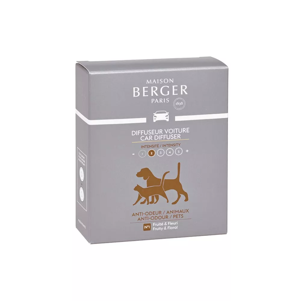 Un lieve profumo fruttato e fiorito, contro gli odori provocati dagli animali, con un iniziale aroma di bergamotto, mela e ribes, un cuore di fresia, mughetto e viola ed una coda di sandalo, cedro e muschio. Due ricariche in ceramica, da utilizzare nel diffusore metallico per auto. Tempo di diffusione: 4/6 settimane.