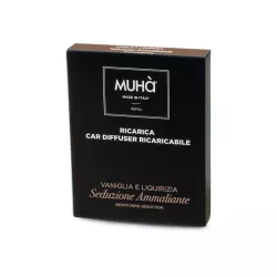 La ricarica per profumatore auto Vaniglia e Liquirizia firmata Muha e pensata per garantire un rilascio graduale e duraturo di una fragranza intensa e avvolgente. Compatibile con il diffusore auto in ecopelle lucida dal design moderno, rinnova l abitacolo con un aroma deciso e contemporaneo. Vaniglia e Liquirizia unisce la profondita della liquirizia nera alla delicatezza della vaniglia, arricchite da note di cocco, fieno greco e legno di guaiaco, per un profumo penetrante e rigenerante. Un essenza distintiva e il regalo perfetto per chi ama fragranze calde e caratterizzanti.