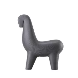 La Ghoda Chair è una sedia con una presenza fisica energica. Il sedile è evoluto dal lavoro più iconico di Satyendra Pakhalé, la famiglia B.M. Horse creata nel 2000 come edizioni limitate in bronzo. La Ghoda Chair fa riferimento alla sua 'sensualità' e al 'processo di fusione a cera persa spaghetti', è un progetto tra artigianato e industria, la sua immagine oscilla tra cultura etnica e pop. Ora prodotta industrialmente da Qeeboo in polietilene riciclabile in vari colori e combinazioni, la Ghoda Chair diventa il protagonista principale in qualsiasi spazio interno o esterno. Materiale: Polietilene riciclabile Dimensioni: 76 x 46 x 91 cm Peso: 5,5 kg Altezza seduta: 45 cm