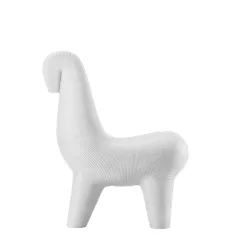 La Ghoda Chair è una sedia con una presenza fisica energica. Il sedile è evoluto dal lavoro più iconico di Satyendra Pakhalé, la famiglia B.M. Horse creata nel 2000 come edizioni limitate in bronzo. La Ghoda Chair fa riferimento alla sua 'sensualità' e al 'processo di fusione a cera persa spaghetti', è un progetto tra artigianato e industria, la sua immagine oscilla tra cultura etnica e pop. Ora prodotta industrialmente da Qeeboo in polietilene riciclabile in vari colori e combinazioni, la Ghoda Chair diventa il protagonista principale in qualsiasi spazio interno o esterno. Materiale: Polietilene riciclabile Dimensioni: 76 x 46 x 91 cm Peso: 5,5 kg Altezza seduta: 45 cm