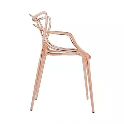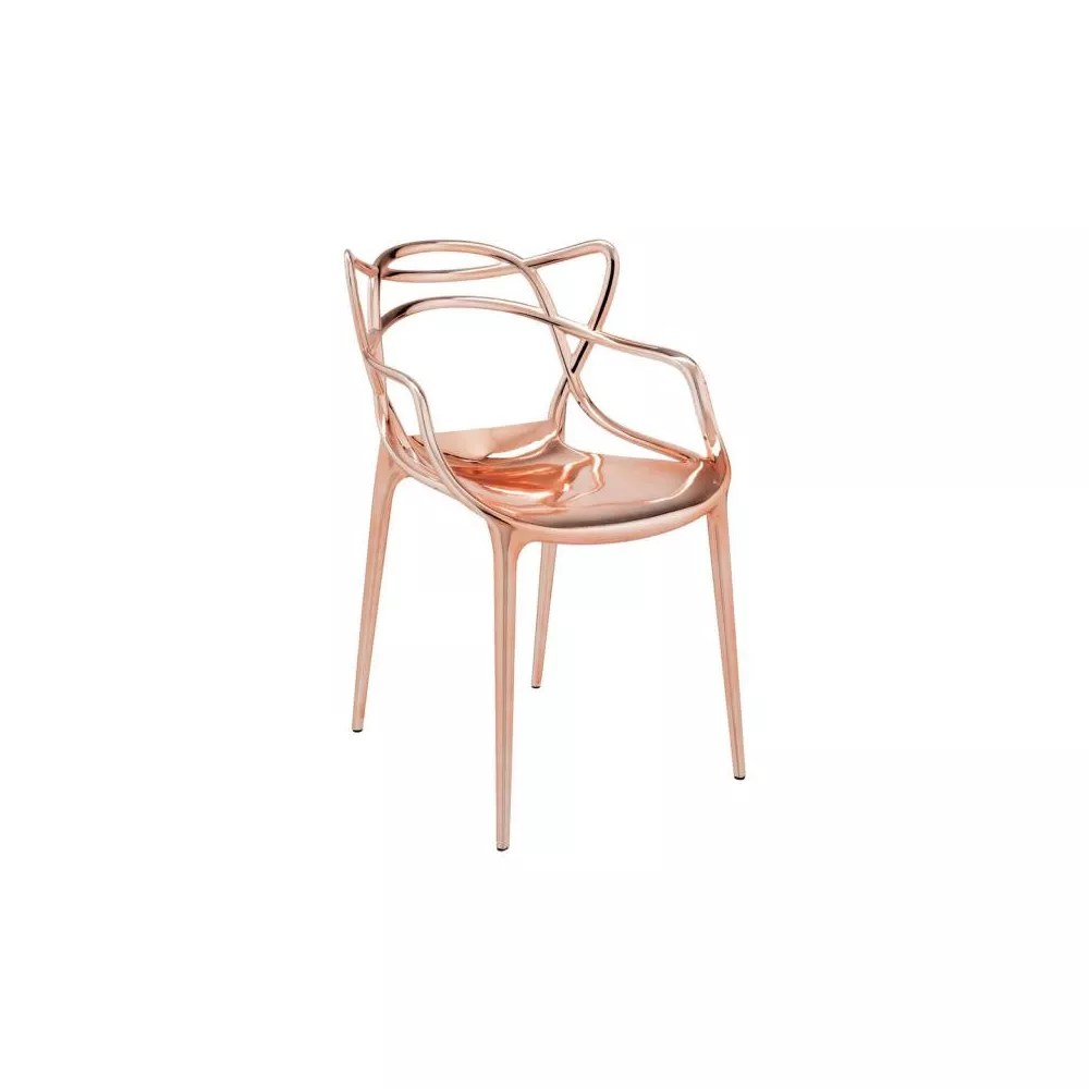 SEDIA MASTERS METAL, 5864 - KARTELL La sedia Masters, qui proposta nella sua versione metallizzata, è un omaggio acuto a tre sedie simboliche, rielaborate e reinterpretate dal genio creativo di Starck. Grazie a una particolare finitura, la sedia assume un aspetto vellutato e sensuale. La caratteristica distintiva principale è lo schienale, che presenta l'incrocio curvilineo di tre diverse spalliere che si fondono con il bordo del sedile, creando un contrasto tra spazi vuoti e pieni. La sedia è leggera, pratica e disponibile in una vasta selezione di colori. Materiale Struttura: Polipropilene Modificato Colorato In Massa Ignifugo: Non Ignifugo Uso: indoor Altezza: 83 cm Larghezza: 53,5 cm Profondità: 55 cm Altezza Seduta: 46 cm