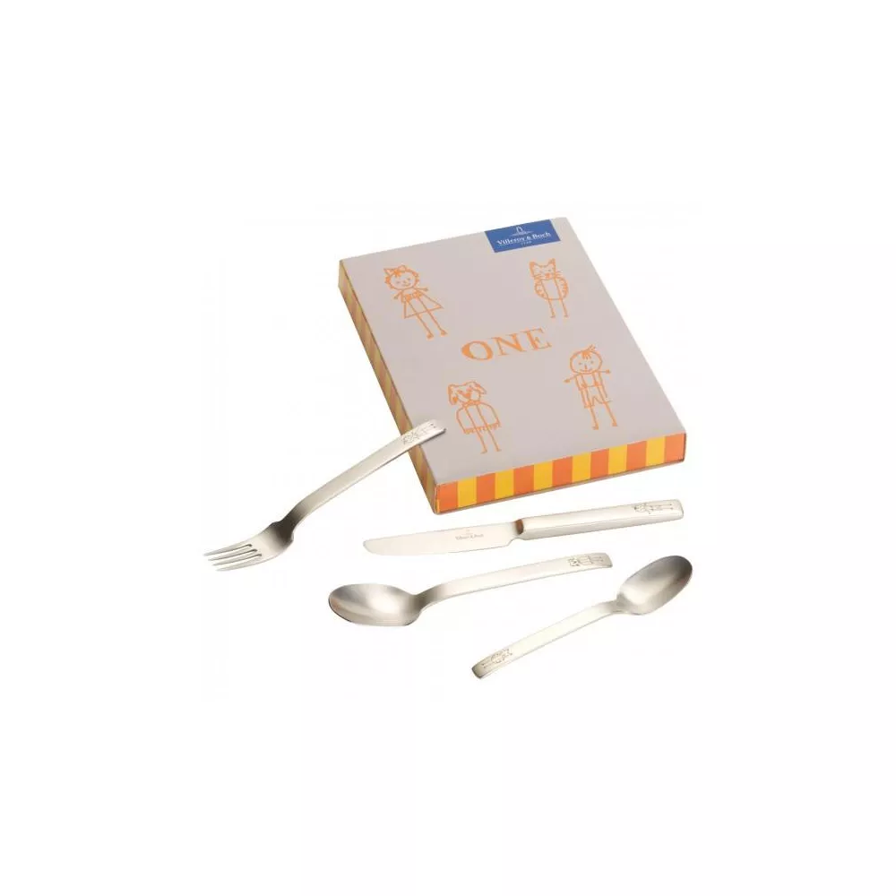 One Posate bambini 4 pezzi - Set composto da: 1 x Cucchiaio bambini 1 x Forchetta bambini 1 x Coltello bambini 1 x Cucchiaio caffe bambini numero articolo 1263922091- inalterabile in lavastoviglie- Dimensions 21,5X15X2,5CM- Materiale acciaio inossidabile- peso approx. 161 g