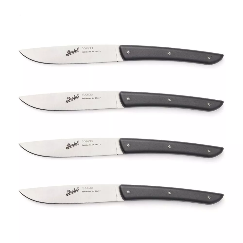 Set di 4 coltelli da tavola per piatti di carne, pesce, aperitivi e altro ancora! Il set comprende coltelli da bistecca con lama liscia e manico nero dalla finitura opaca, corti e maneggevoli. Grazie alla punta e all'affilatura, sarà possibile tagliare con precisione la carne cotta, riducendo gli sfilacciamenti. Questi coltelli Berkel in acciaio sono resistenti alla corrosione e allo sfregamento con la ceramica del piatto, caratteristiche essenziali per un utilizzo quotidiano e garanzia di durata nel tempo.