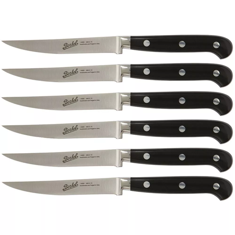 Adhoc Set 6 coltelli bistecca Berkel Un set di coltelli da tavola ideali per servire piatti a base di carne. Questi coltelli corti e maneggevoli, grazie alla loro punta affilata e alla lama seghettata, permettono di tagliare con precisione la carne cotta, evitando tagli frastagliati e inestetici. Resistenti alla corrosione e ai tagli su piatti in ceramica, caratteristiche essenziali per un uso quotidiano. Materiale lama: Forgiato in acciaio inox 1.4116 azotato (durezza fino a 59 hrc) Affilatura: liscio, senza denti sku: KAD6SW11SRGB Lama lunga: 11 cm Lunghezza e peso totali: 21,5 cm / 430 gr Impugnatura: Impugnatura composta da due guancette assemblate con rivetti in alluminio SCOPRI TUTTA LA COLLEZIONE: Coltelli Adhoc | Berkel