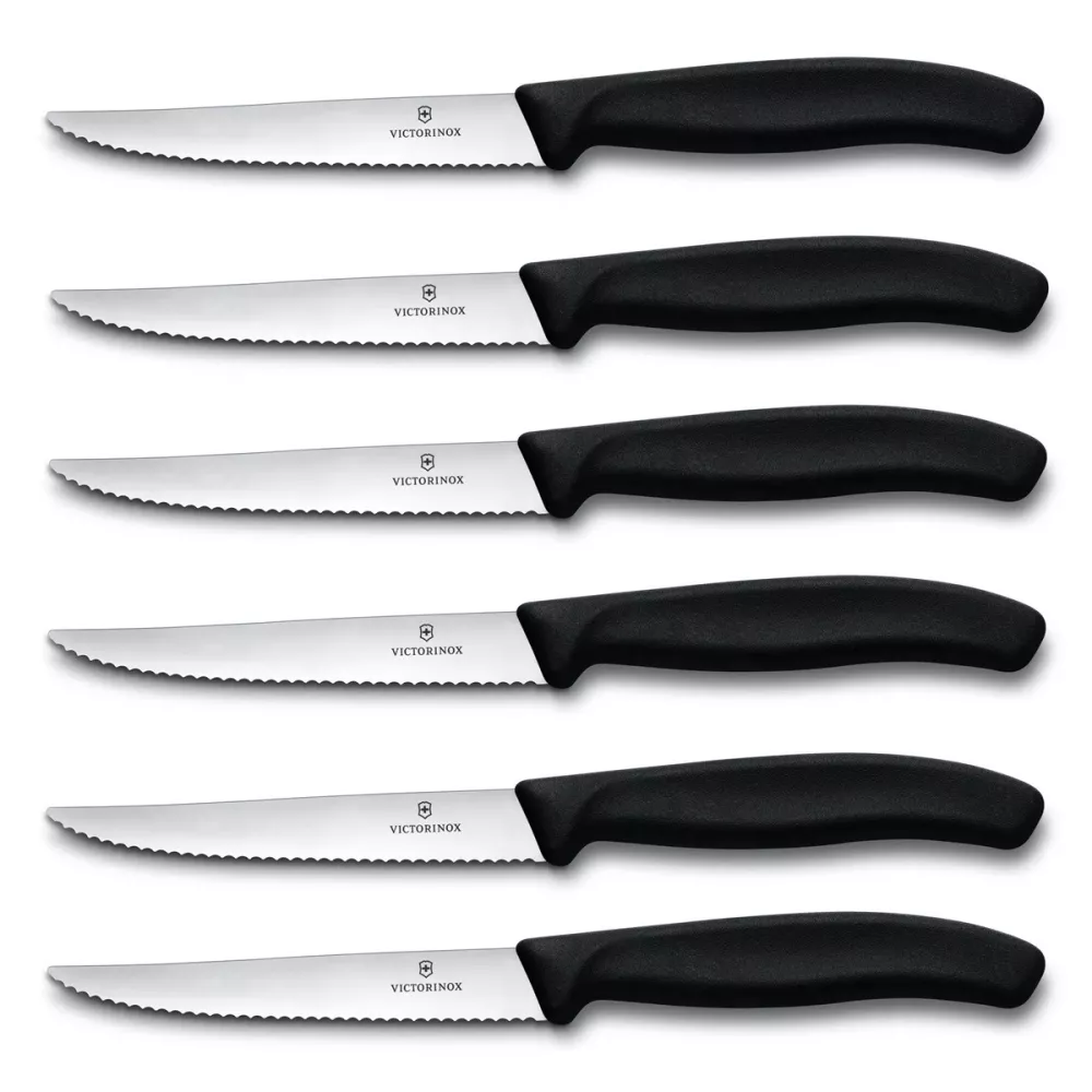 Set 6 coltelli Swiss Classic da bistecca/pizza con lama ondulata e manico nero. La collezione di coltelli Swiss Classic di Victorinox è stata progettata per affrontare tutto ciò che si può fare in cucina, dal compito più piccolo a quello più impegnativo. Sono coltelli leggeri con manici colorati lavabili in lavastoviglie, 100% Swiss Made. In una collezione in cui la funzionalità incontra l’allegria, non potevano mancare gli utilissimi ceppi portacoltelli e vari set regalo. In questa collezione non manca nulla. Sku: V-6.72 33.6 Manico nero in Polipropilene Lunghezza lama: 12 cm Swiss Made
