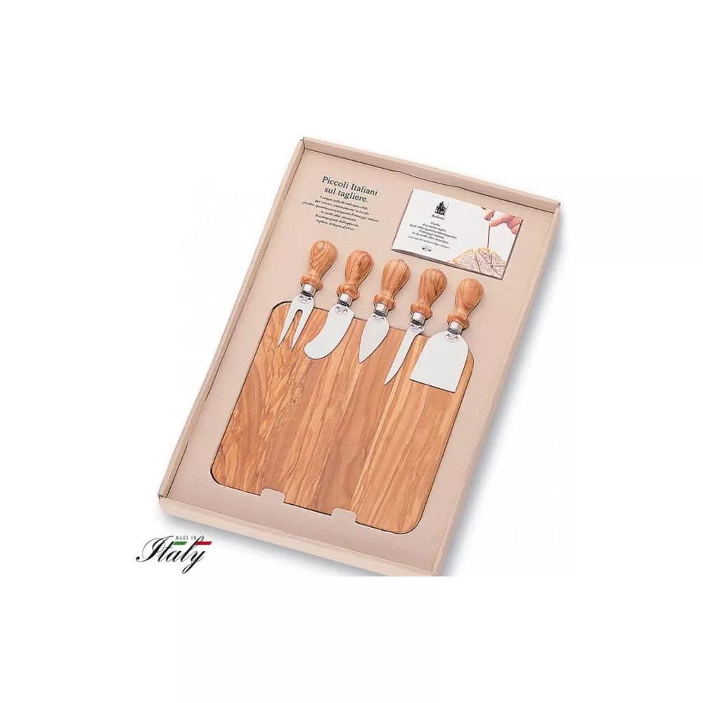 Il set di 5 coltelli per formaggio Berti con manico in legno di ulivo è l'accessorio perfetto per gli amanti del formaggio. Ogni coltello è progettato per tagliare con precisione vari tipi di formaggi, dai più morbidi ai più duri. Il manico in legno di ulivo non solo conferisce un tocco di eleganza naturale, ma garantisce anche una presa comoda e sicura. Il set include un tagliere abbinato, che completa questo raffinato corredo. Ogni pezzo è realizzato a mano in Italia, espressione della qualità artigianale Berti.