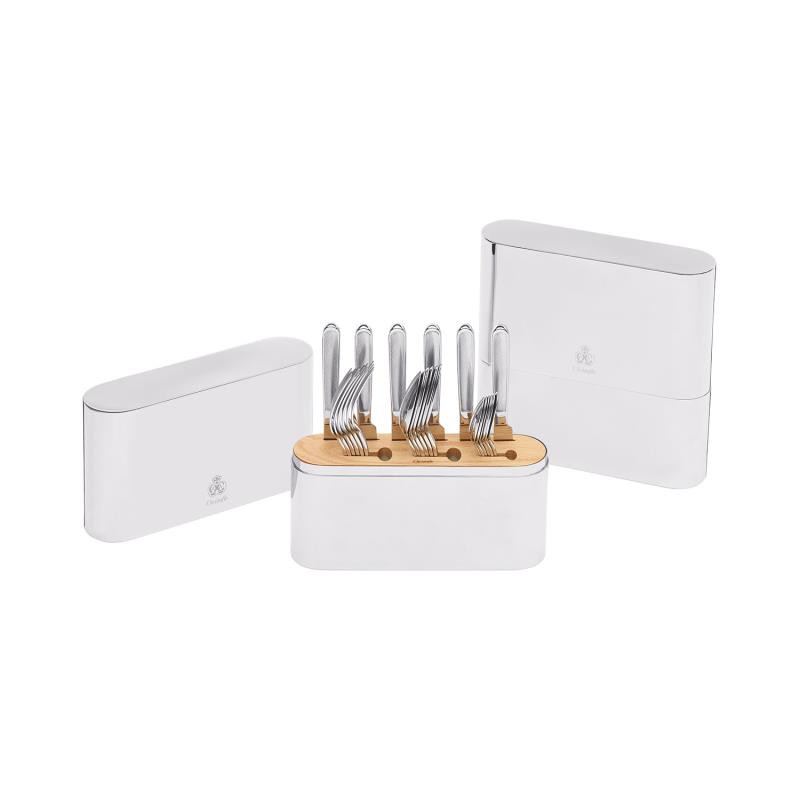 Christofle Concorde set posate 24 pezzi Questo set di 24 pezzi in acciaio inossidabile contiene ognuno dei seguenti elementi per 6 persone: forchette da tavola, coltelli da tavola, cucchiai da tavola e cucchiaini da caffè. Con Concorde, Christofle propone un nuovo caso con linee urbane associate a un modello originale di posate. Design ispirato alla forma oblunga della "Place de la Concorde" parigina, Concorde combina il bello con l'uso quotidiano, l'eleganza con il relax, puro con ornamenti. MATERIALE • Acciaio inossidabile Set di: 6 cucchiai da tavola, 6 coltelli da tavola, 6 forchette da tavola, 6 cucchiaini da caffè