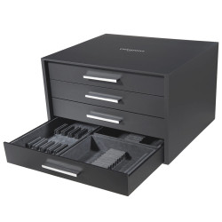 Servizio di posate da 24 pezzi per 6 persone in metallo dorato 24 carati Questa nuova ed esclusiva versione di MOOD GOLD aggiunge un tocco d'oro 24 carati sulle posate e sulla scatole. Questo elegante cofanetto svela posate moderne con finiture di lusso in un sottile gioco di luci e riflessi dorati. MOOD GOLD, un concetto di stile di vita raffinato, illumina tutti gli interni e accompagna commensali eccezionali. Set di 24 posate: - 6 forchette da tavola - 6 coltelli da tavola - 6 cucchiai da tavola - 6 cucchiaini da caffè MATERIALE • Lega argentata DIMENSIONI • H 30 cm x 20 cm