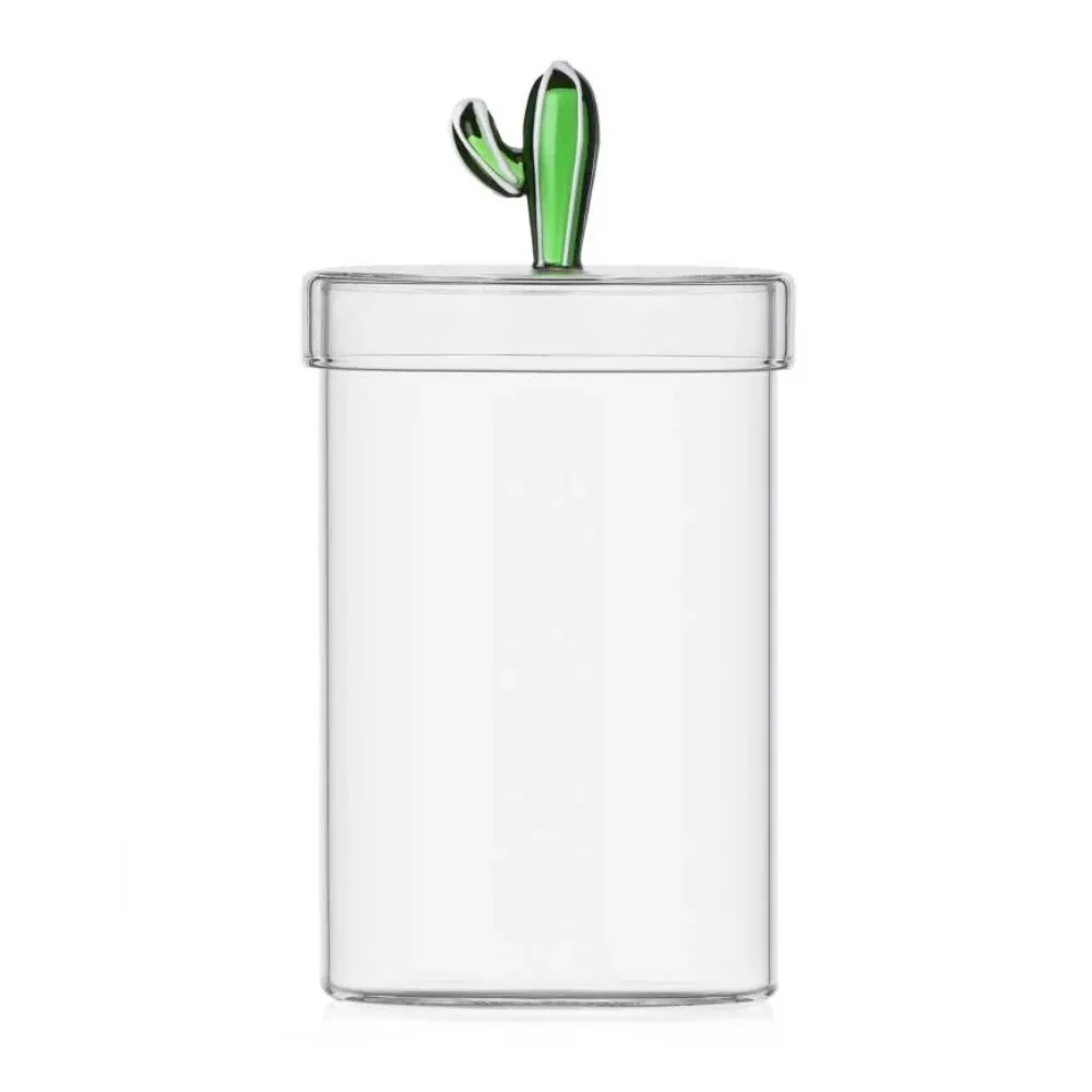 Questa scatola in vetro borosilicato fa parte della collezione Desert Plants disegnata da Alessandra Baldereschi. Realizzata a mano e modellata a lume, si distingue per la decorazione verde ispirata alle piante succulente. Un oggetto decorativo funzionale che dona un tocco di originalità e design a ogni ambiente.