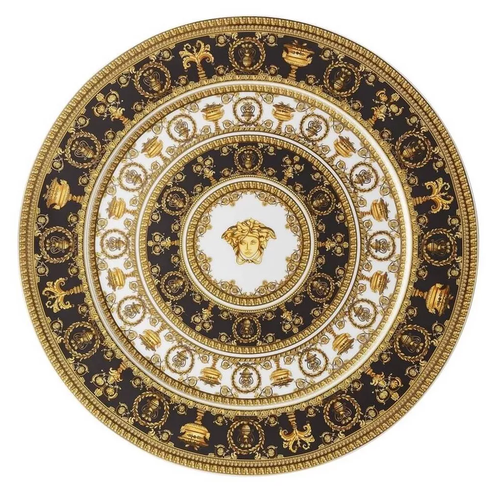 Da un glorioso passato e subendo sempre il fascino di epoche storiche dal grande glamour, la casa di moda Versace ha dato vita a collezioni senza tempo e insieme così contemporanee e nel nuovo servizio " I ? Baroque", di Rosenthal meets Versace, combina l'opulenza barocca con i moderni colori base del nero, bianco e oro. Stupenda, la testa della Medusa spicca al centro del piatto, mentre simboli neo classici si avvicendano lungo i bordi e sono incorniciati da una fascia lineare più definita. Vasi, coppe e ornamenti in nero opaco o bianco brillante decorano la collezione e sono classicamente rifiniti in oro zecchino. Materiale: porcellana Diametro: 33 cm