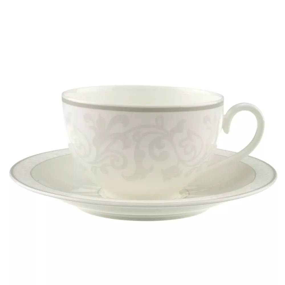 TAZZA COLAZIONE CON PIATTINO, GRAY PEARL 10-4392-1240/1250 - VILLEROY & BOCH La collezione Gray Pearl di Villeroy & Boch porta un'eleganza raffinata sulla tavola: le forme classiche e le decorazioni delicate dal tenue colore grigio argento conferiscono un tocco esclusivo al design. Offrite deliziosi contorni su un piatto di tendenza impreziosito da sottili tralci di vite. Sku: 1043921240 + 1043921250 Capienza: 400 ml Dimensioni piattino: 18 cm