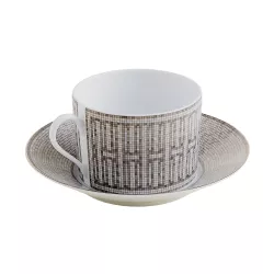 La tazza colazione con piattino Mosaique au 24 di Hermès rappresenta un perfetto equilibrio tra eleganza senza tempo e design iconico. Realizzata in porcellana con decorazioni serigrafate e applicate a mano, è impreziosita da dettagli in oro o platino che valorizzano i raffinati motivi geometrici della collezione.