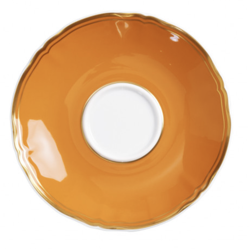 Regali bordi in oro si ispirano e rivisitano in cangianti colori la collezione Polka. Otto colori conferiscono modernità a questo decoro Luigi XV: grigio blu, avorio, giallo, nero, arancione, rosso, turchese e verde. Riferimento : 0869-40-318025/368016 Diametro piatto: 16 cm Altezza tazza: 5,6 cm Capacità: 25 cl Materiale : Porcelain Colore : Arancio